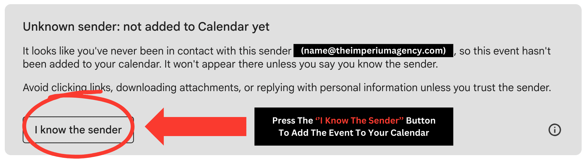 You may also notice an email from Google titled "Invitation from an unknown sender". This is due to a recent Google Calendar update that has a slight technical bug. If you see this email, select "Yes" on the calendar appointment to avoid confusion.